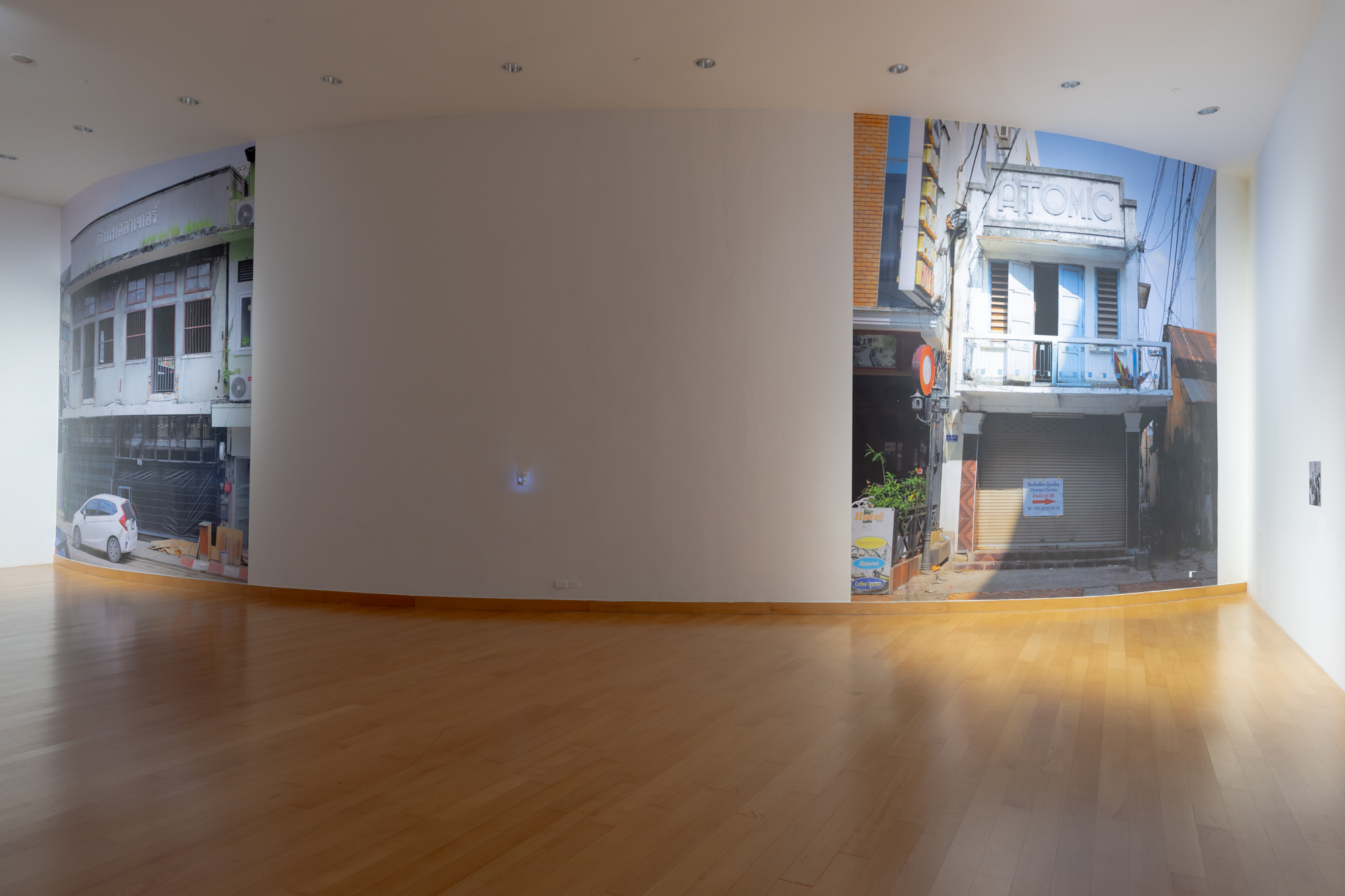 In the exhibition, these photographs are positioned on opposite sides of a single wall. Although geographically close, the two buildings are rendered distant through a curved and distorted wall structure, which alters the viewer’s perception—neither image can be seen clearly from any single vantage point. These blind spots act as metaphors for the relationship between the two neighbouring countries, once entangled in broader geopolitical conflict.